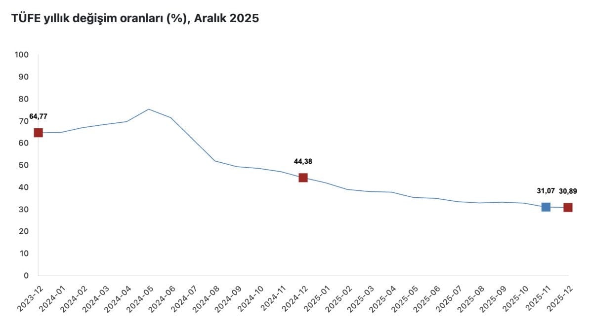 TÜFE’deki değişim 2025 yılı Aralık ayında bir önceki aya göre yüzde 0,89 artış, bir önceki yılın Aralık ayına göre yüzde 30,89 artış, bir önceki yılın aynı ayına göre yüzde 30,89 artış ve on iki aylık ortalamalara göre yüzde 34,88 artış olarak gerçekleşti.