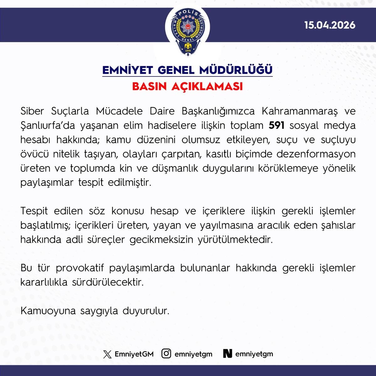 EGM duyurdu! Dezenformasyon ürettiği saptanan 591 sosyal medya hesabı hakkında işlem başlatıldı 2 saat ago