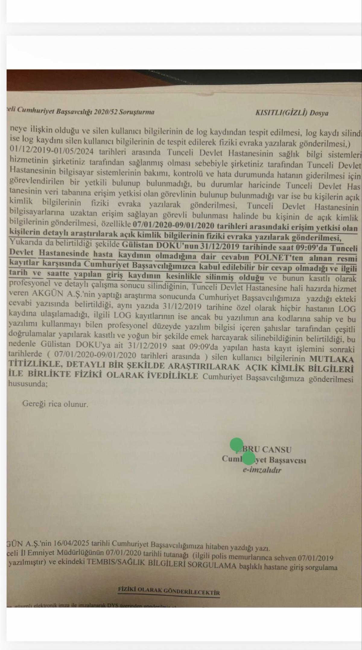 Gülistan Doku soruşturmasında Başsavcılık, gizli tanık iddiasına göre uyuşturucu madde etkisi altında iken istismar edildiği iddia edilen Gülistan Doku’nun hastane başvuru kaydının POLNET ekranında görüldüğü halde hastane kayıtlarında çıkmaması üzerine yapılan araştırmada o güne dair tüm kayıtların silindiği şeklinde bir bulguya ulaşıyor.