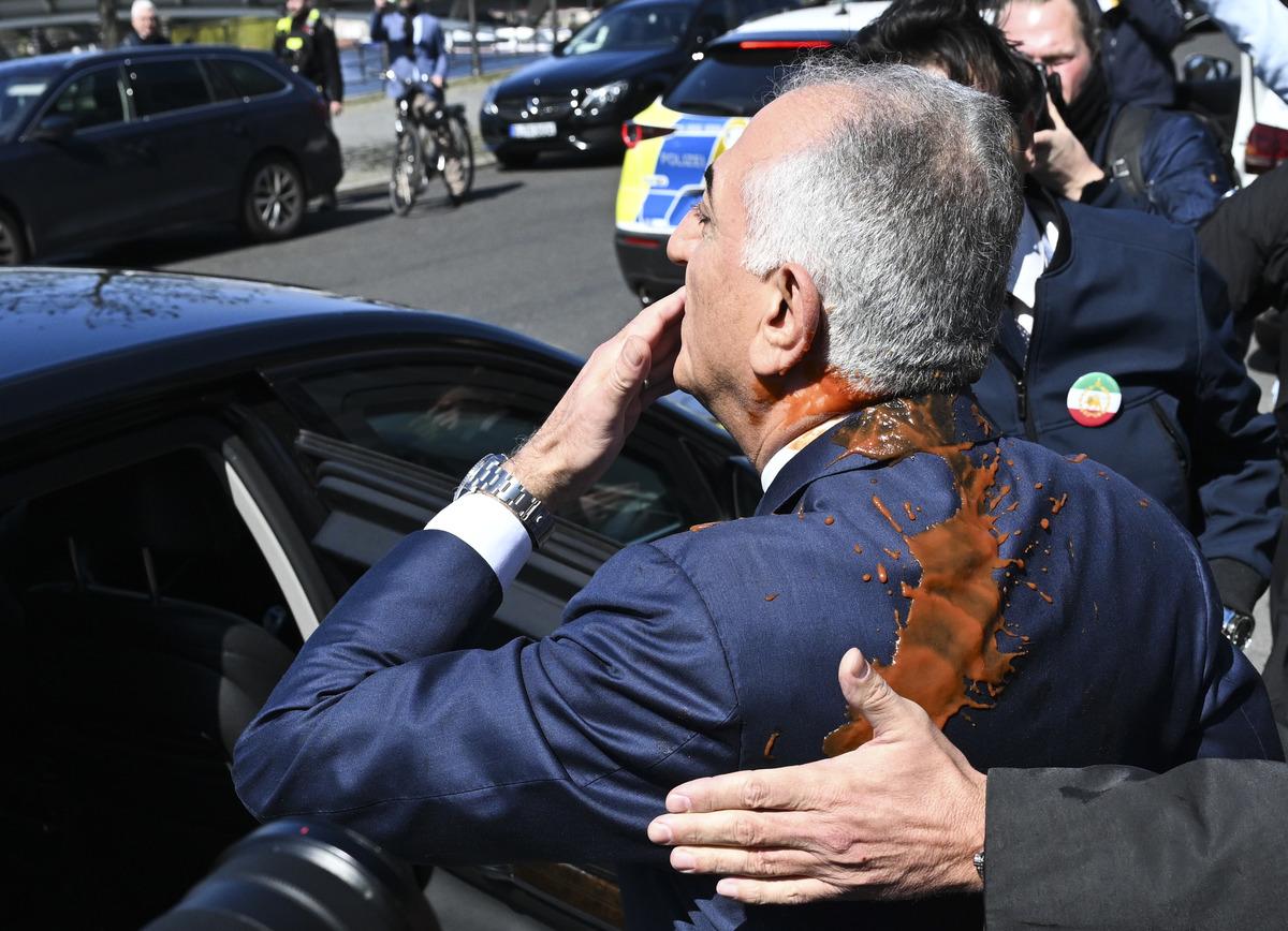Pehlevi, başkent Berlin’de Federal Basın Evi’nde basın toplantısı düzenledi. Binanın önündeki bir kişi, toplantının ardından korumalarıyla aracına giden Pehlevi’nin üzerine kırmızı sıvı attı. Sıvı, Pehlevi’nin sırtına ve ensesine geldi.