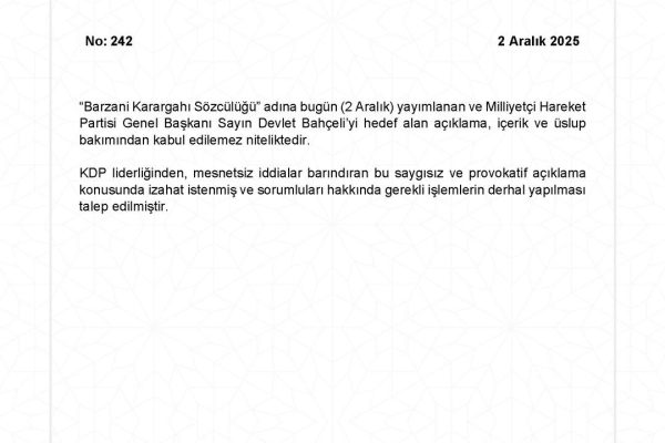 Dışişleri Bakanlığı tarafından yapılan açıklamada, MHP lideri Bahçeli’yi hedef alan “Barzani Karargahı Sözcülüğü” ve kullandığı…